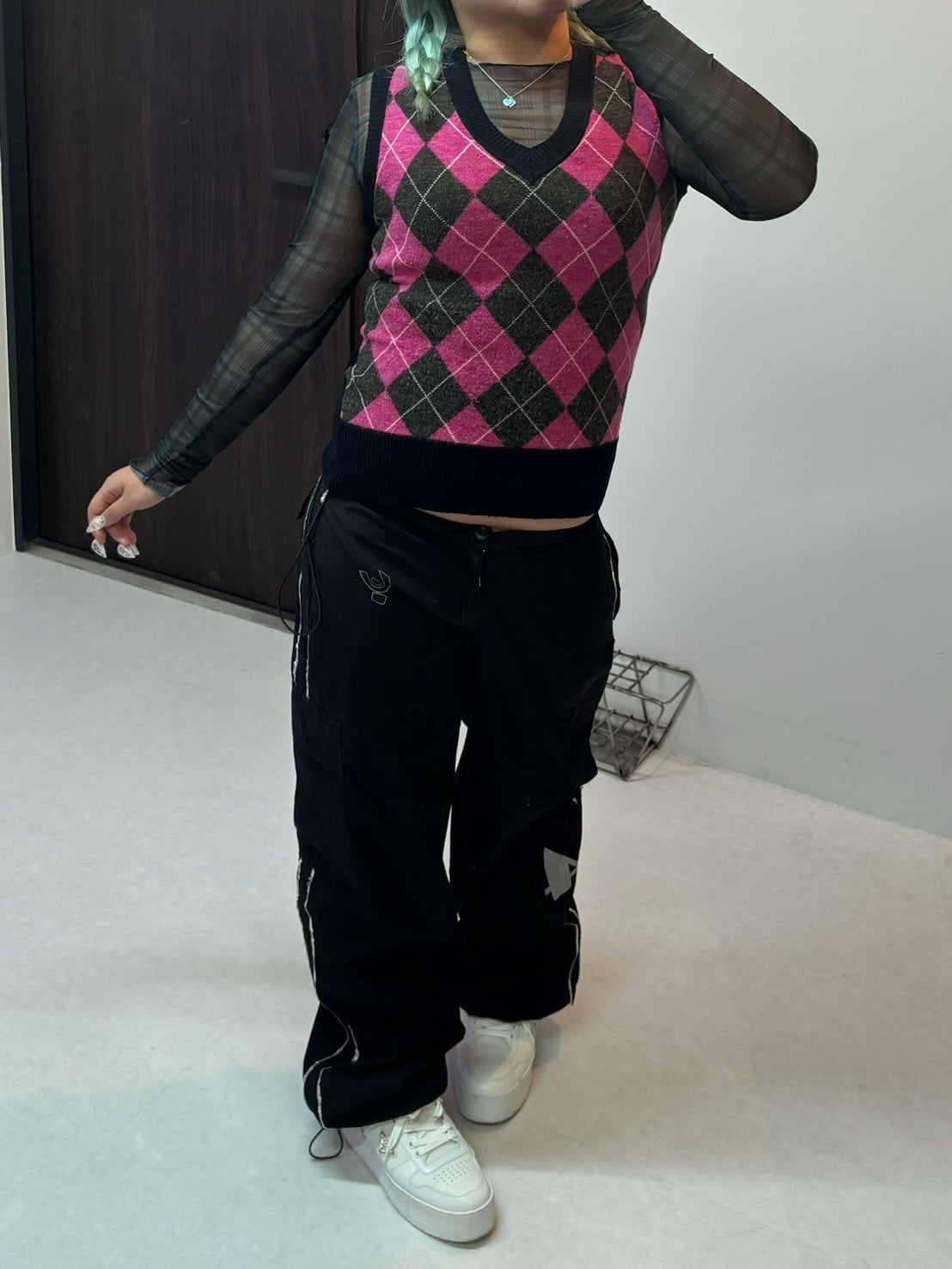 素材: 94%Polyester 6%Spandex サイズ: S(表記) 肩幅41cm 身幅40cm 総丈36cm ダメージ: 画像11枚目のような糸のほつれがあります。 着用モデル身長: 155cm