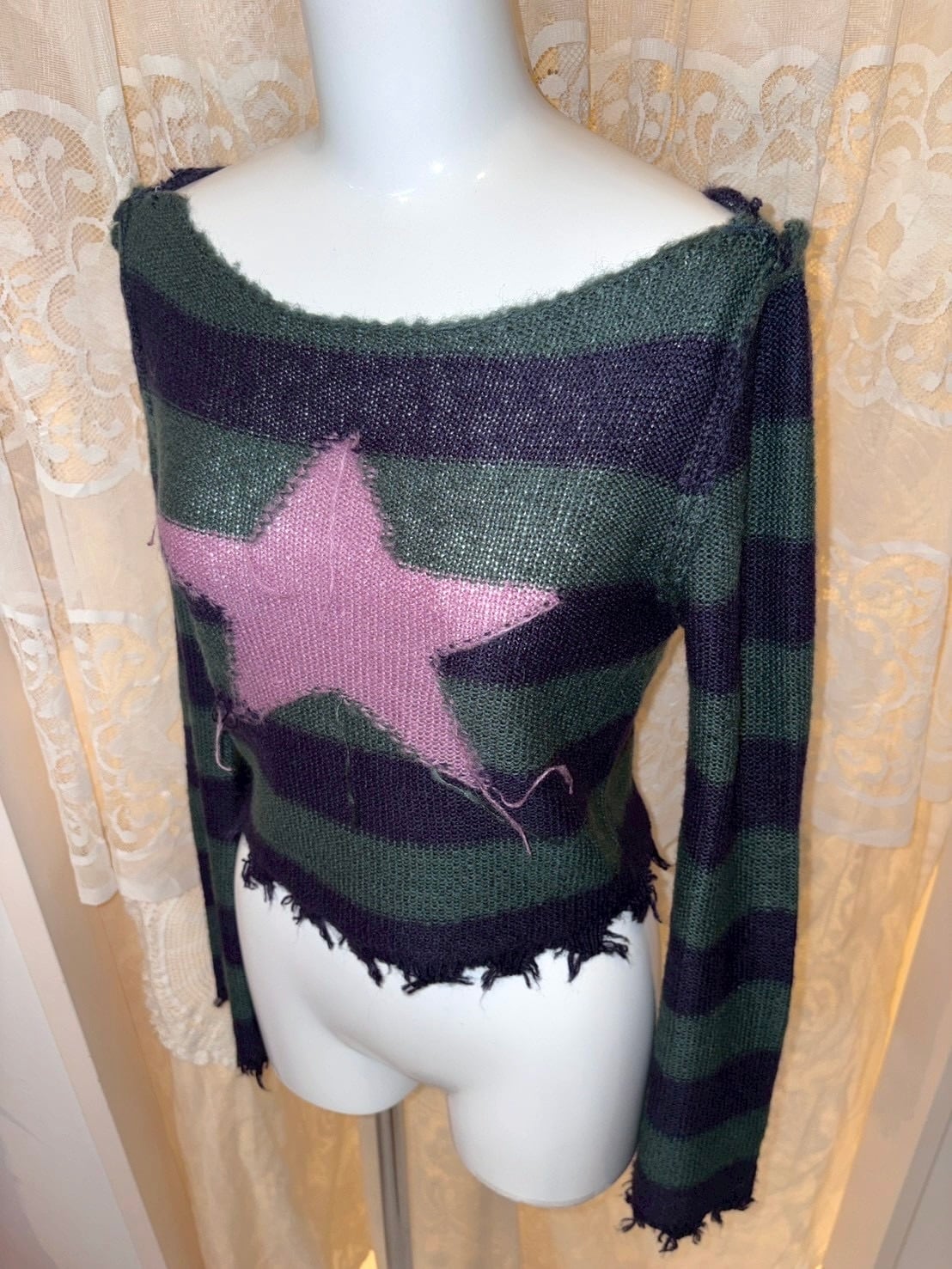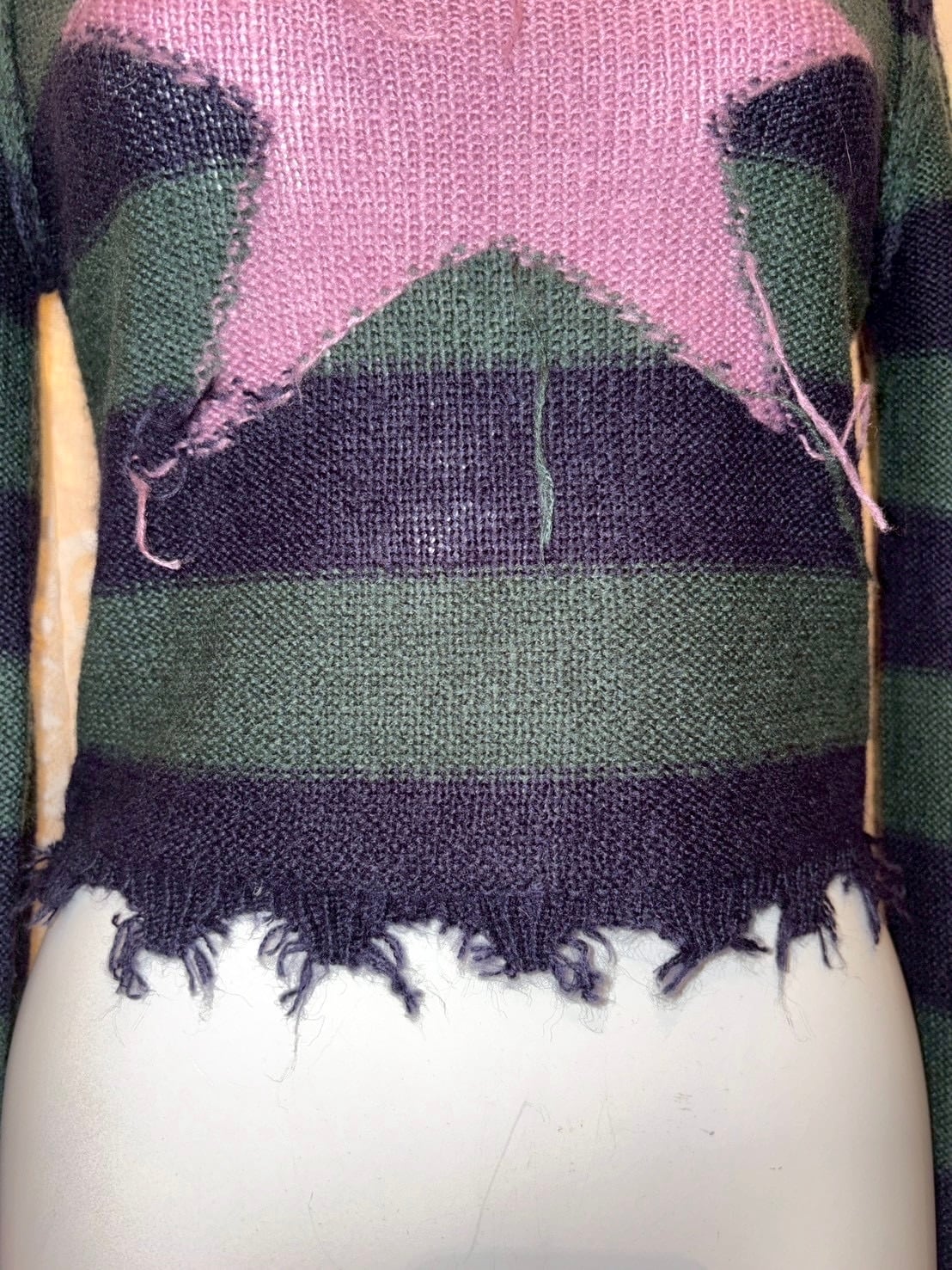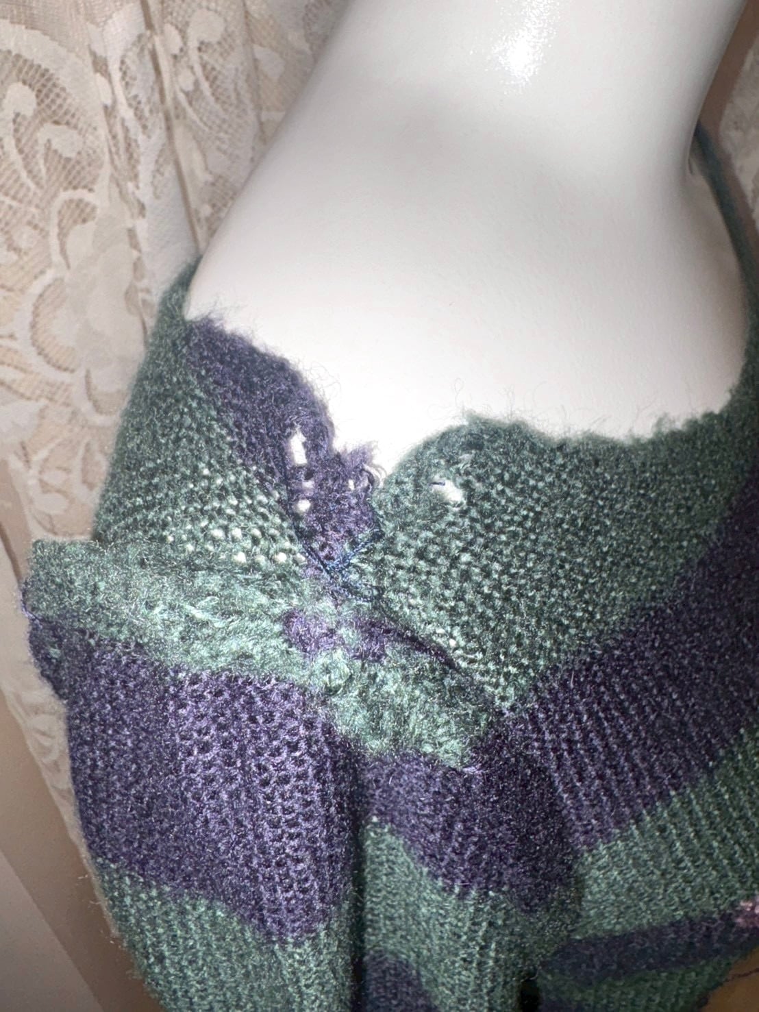 素材: 100%Acrylic サイズ: S(表記)肩幅32cm 身幅46cm 袖丈60cm 総丈43cm ダメージ: デザイン上、糸のほつれがあります。 着用モデル身長: 163cm