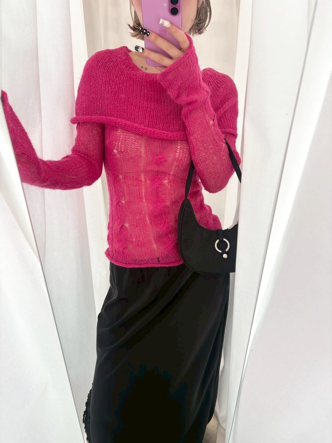素材: 55%Ramie 30%Acrylic 15%Mohair サイズ: S(表記)肩幅45cm 身幅39cm 袖丈75cm 総丈60cm 着用モデル身長: 163cm